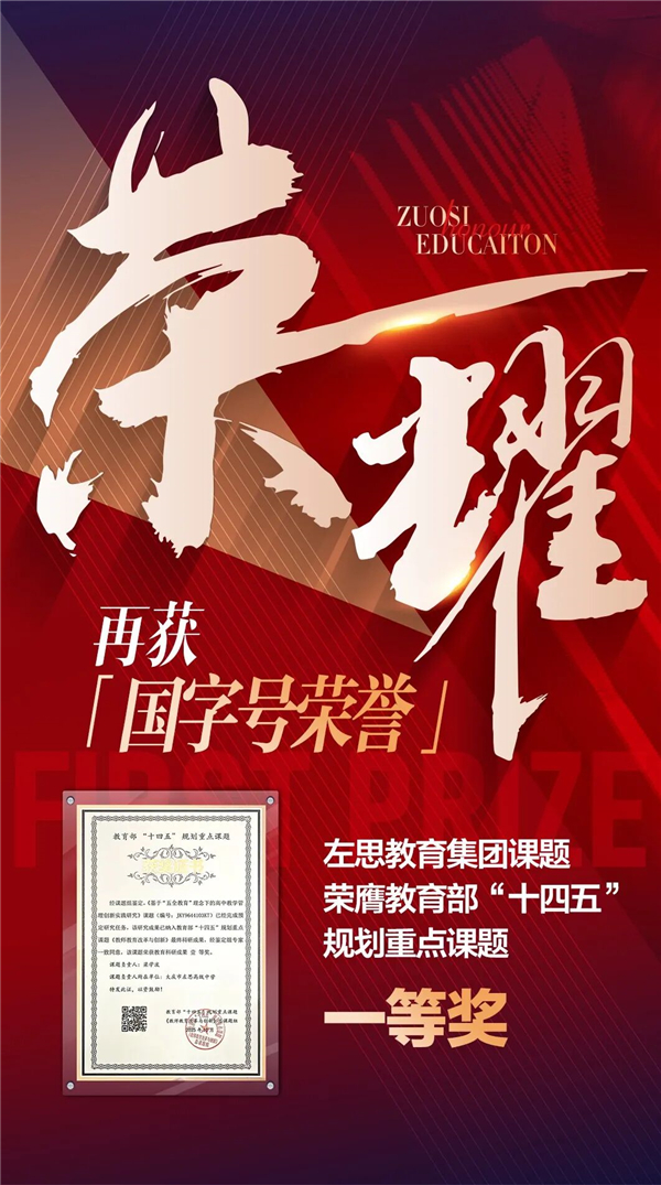 教育部“十四五”规划重点课题壹等奖的获得,是左思教育集团发展史上浓墨重彩的一笔,是全体左思人的光荣与骄傲!