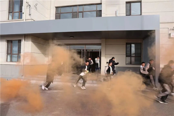 同学们在教师的**引导下,迅速用湿毛巾捂住口鼻,保持弯腰低姿,沿着预定疏散路线快速撤离教学楼。