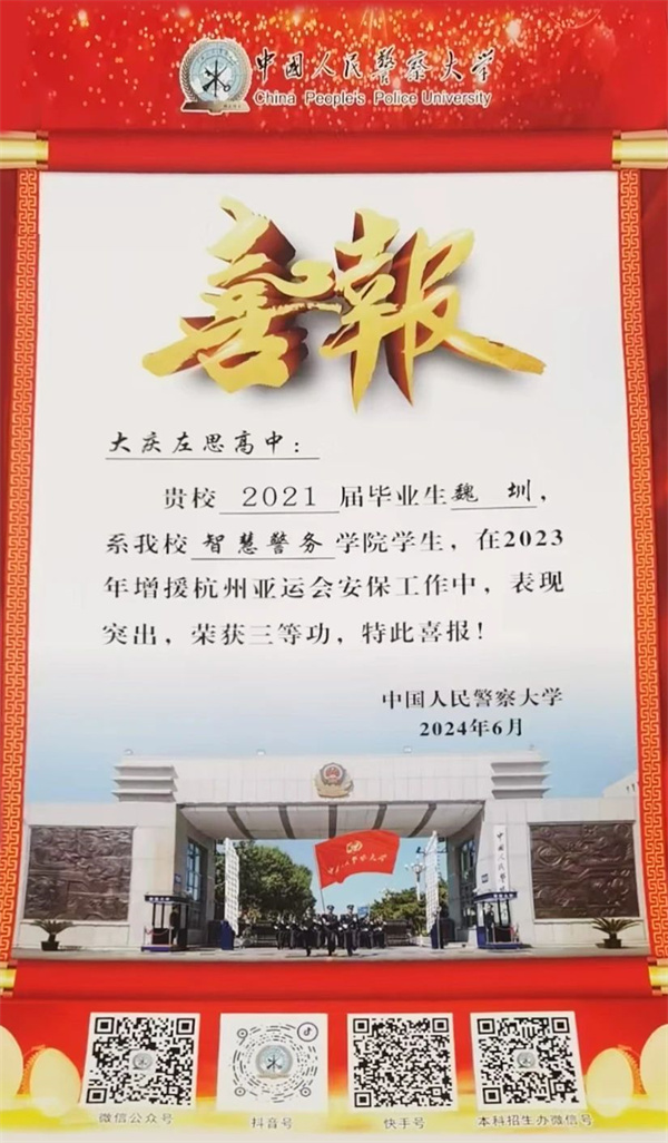 荣耀左思丨**人民警察大学发来贺信:魏圳同学荣获三等功!