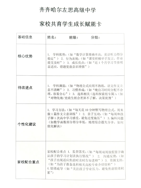 为了让家校共育更有温度,学校针对每组特点推出“家校共育任务卡”——选科探索组的“和孩子共同查阅3所目标高校**要求”,偏科攻坚组的“每周陪孩子做1次薄弱学科专项训练”,让家长明确“能为孩子做什么、该怎么配合”。